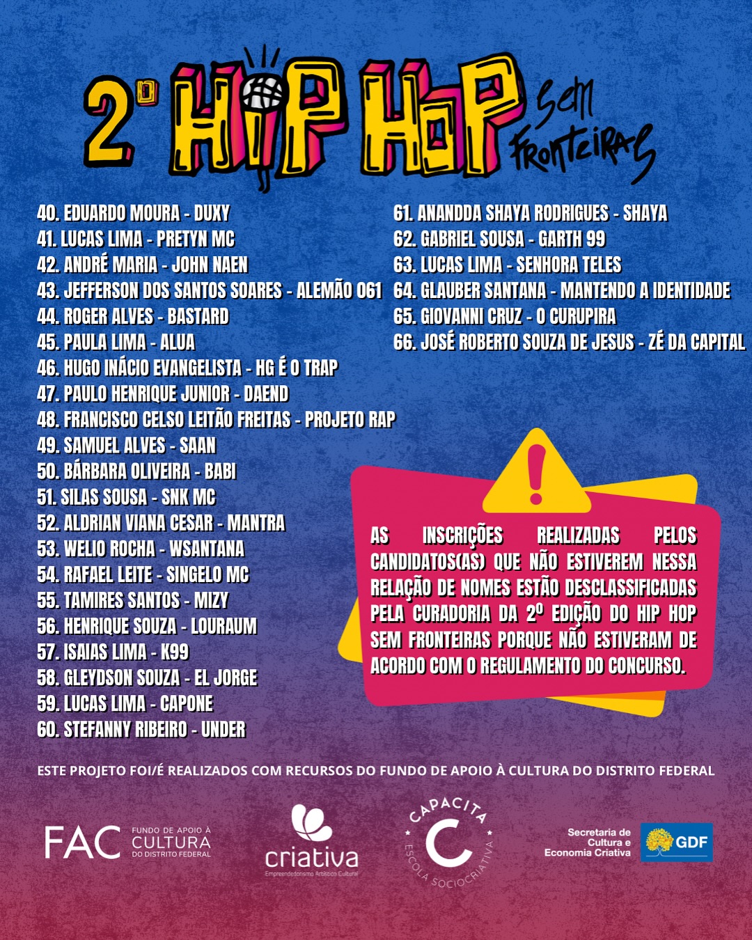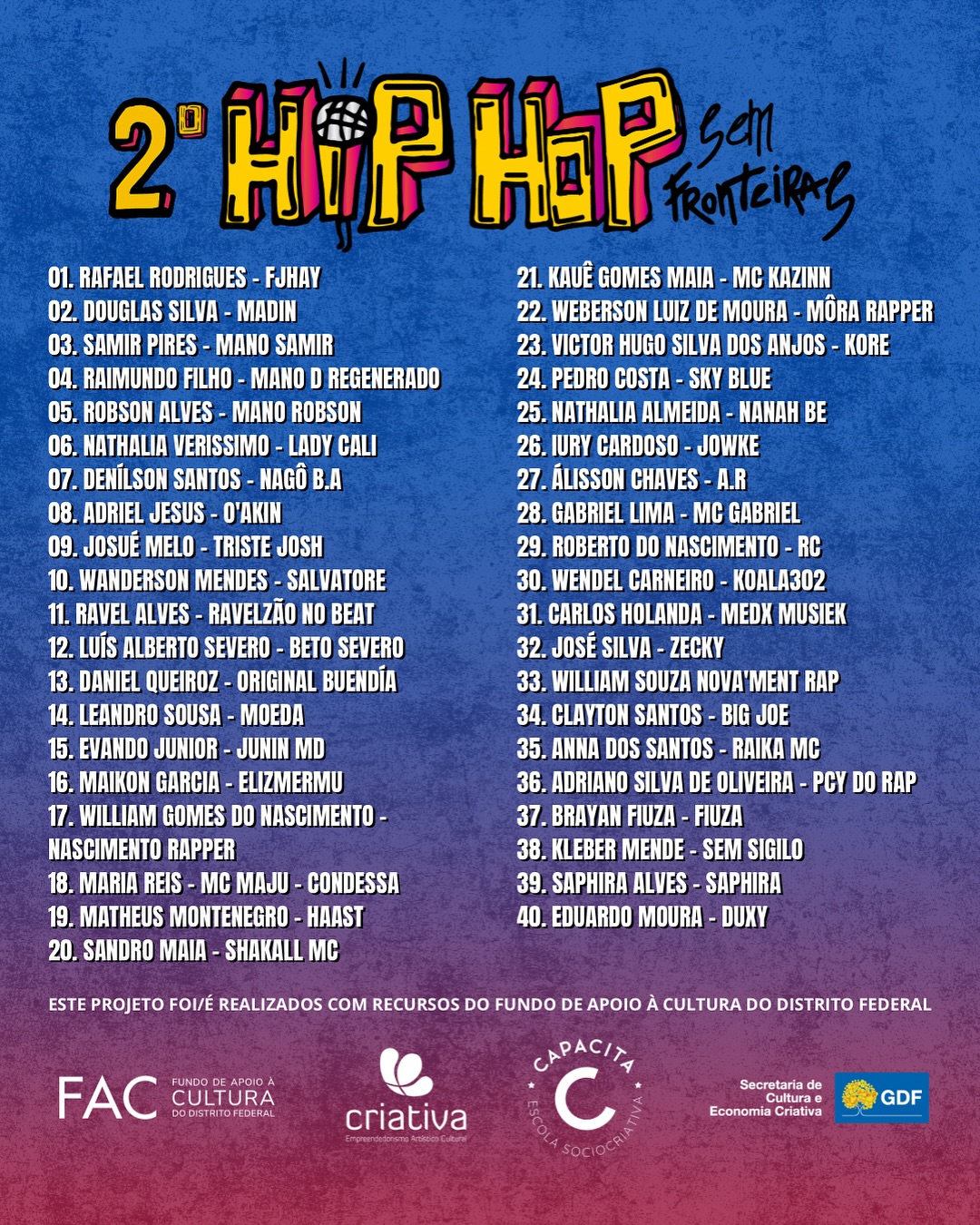 A curadoria da 2ª edição do concurso Hip Hop Sem Fronteiras anunciou os classificados para a próxima etapa. Mais de 70 artistas do Distrito Federal e Entorno participaram do processo de inscrição.