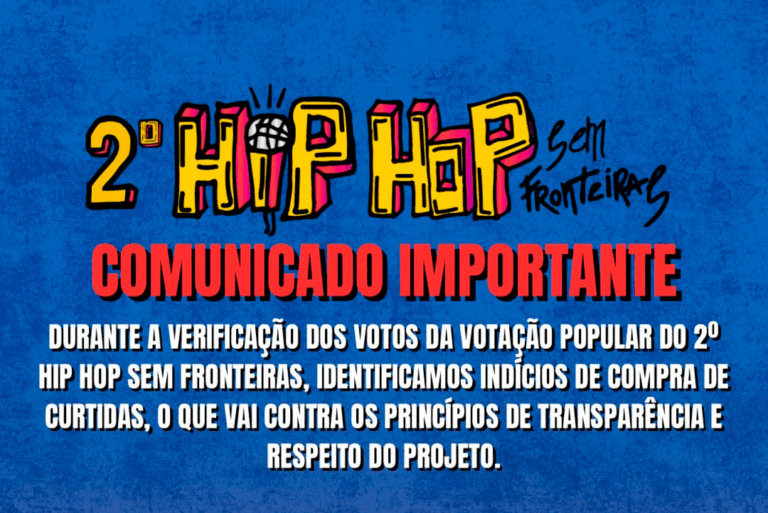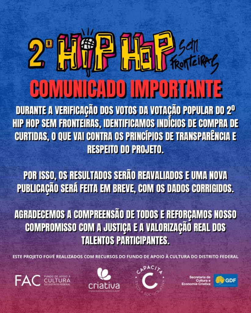 Durante a verificação dos votos da votação popular do 2º Hip Hop Sem Fronteiras, identificamos indícios de compra de curtidas, o que vai contra os princípios de transparência e respeito do projeto.